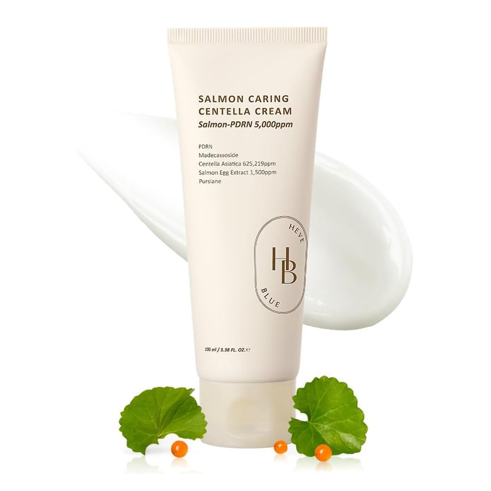 The HEVEBLUE Salmon Caring Centella Cream 100ml is a deeply hydrating face cream formulated to calm irritation, repair skin, and boost elasticity. Enriched with 625,219ppm Centella Asiatica leaf water, this cream instantly soothes sensitive skin while strengthening the barrier.