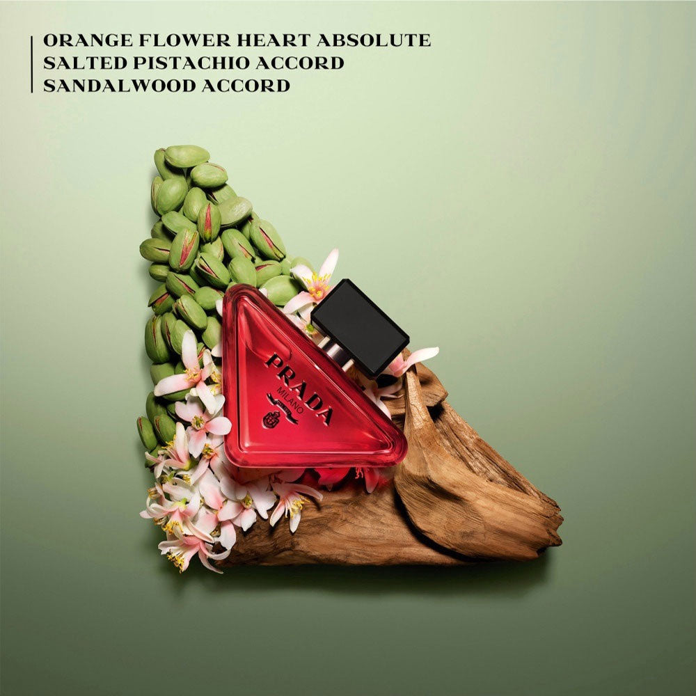 Prada Paradoxe Radical Essence Eau de Parfum is a modern floral gourmand fragrance that balances freshness, warmth, and sensual depth. It opens with radiant neroli oil and orange flower, followed by a distinctive salted pistachio accord that adds a roasted, gourmand twist. The scent finishes with smooth creamy sandalwood, leaving a long-lasting, elegant trail.
